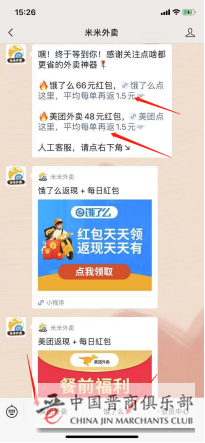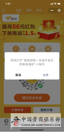 2、只要点击菜单栏的“美团外卖”,在“领红包点外卖”选项点击后页面会跳转到“美团团购-优选外卖买车美食酒店”的小程序;