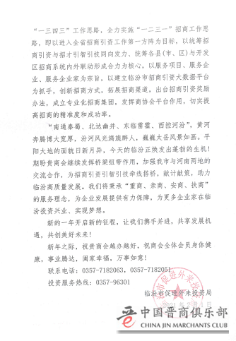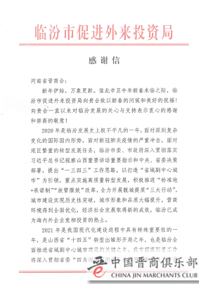 在农历辛丑牛年春节即将来临之际,山西省临汾市促进外来投资局的慰问信向河南省晋商会(中国晋商俱乐部联合发起机构)发来慰问信,信中写到,河南省晋商会:值此辛丑牛年新春来临之际,临汾市促进外来投资局向贵会致以新春的问候和美好的祝福!向贵会一直以来对临汾发展的关心与支持表示衷心的感谢和崇高的敬意!