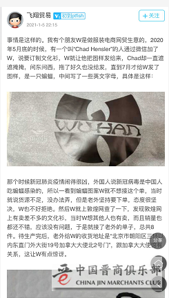今年年初,有中国网友在网上爆料,述说了自己店主朋友“W”的经历。去年5月,一个名叫“Chad Hensler”的人通过微信找到“W”订购一套文化衫,但却遮遮掩掩拖了好久也没给发,直到7月才发送了图样,W发现是一只蝙蝠和“Wu-Han”字样。