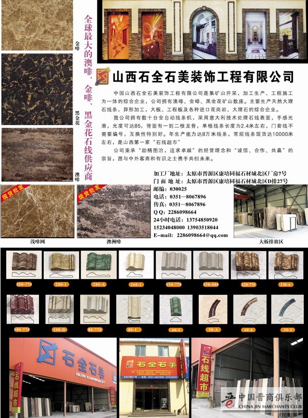 中国山西石全石美装饰工程有限公司是集矿山开发、加工生产、工程施工为一体的综合企业。公司拥有澳啡、金啡、黑金花矿山数座。主要生产天然大理石线条、异形加工、大板、工程 板及各种进口花岗岩、大理石,是全球最大的澳啡、金啡、黑金花石线供应商。