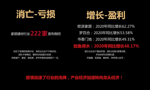 1.纵观行业 消亡-亏损:大数据分析,2020年家居建材行业222家宣布倒闭,经历了疫情的短期冲击,有的企业生产不够夯实,团队不够稳定,整体抗风险能力较差,导致破产、重组、被收购,多年积累的成绩毁于一旦。