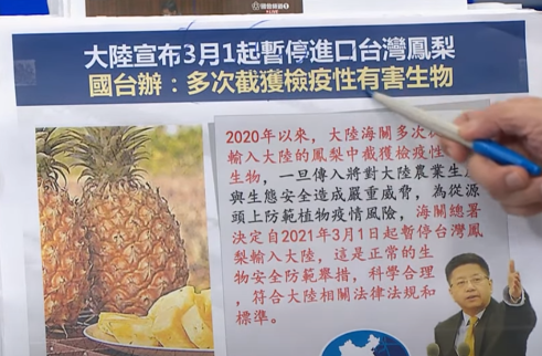 此前,台湾“行政院农业委员会”于26日下午召开记者会,“农委会主委”陈吉仲在会上宣称,从2月底到3月,是菠萝大丰收的季节,大陆“片面”因为介壳虫宣布3月起停止进口台湾菠萝,完全不符合国际贸易规范。