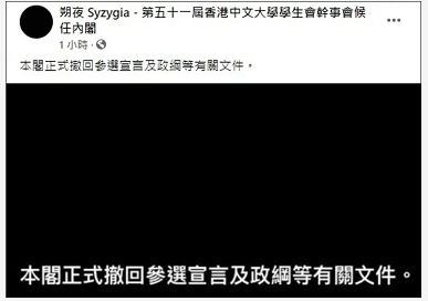 综合“东网”等港媒2月27日报道,新一届香港中文大学学生会干事会、候任“内阁”——“朔夜”,于27日凌晨在脸书上宣布,正式撤回参选宣言及政纲等有关文件。