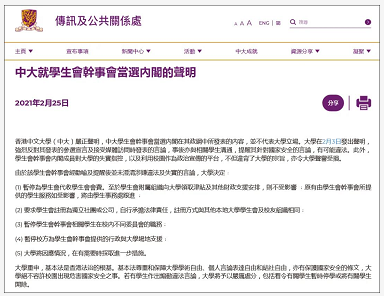 25日晚,港中大宣布,“朔夜”经劝喻及提醒后并未澄清涉嫌违法及失实的言论,校方决定对该候任“内阁”实施5项制裁措施,并强调中大学生会干事会当选“内阁”在其政纲中发表的内容,不代表大学立场。