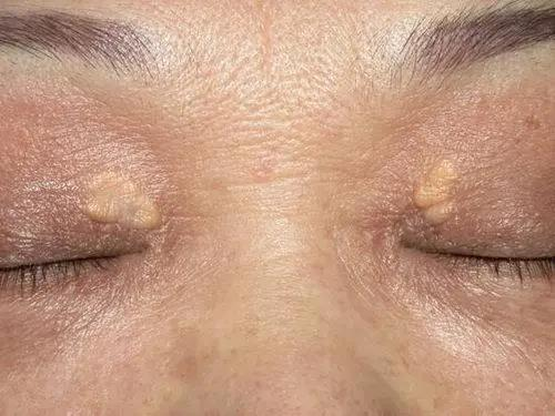 中老年人,尤其是女性,眼睑上新出现黄色、橘色或者棕红色斑块或者结节,不痛不痒,就很可能是黄色瘤。它常长在上眼睑的内眼角处,也可能出现在面部其他部位或膝盖上,针头或黄豆大小,边缘略高出皮肤表面,质地较柔软。