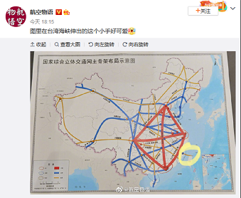 知名航空博主@航空物语 随后更是在这张图上标注出了从大陆通向台北的交通线路,并配文写道:“图里在台湾海峡伸出的这个小手好可爱。”