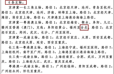 据观察者网此前报道,在近期引人关注的《纲要》中,“京津冀-粤港澳”这一交通主轴的布局存在着亮点,海峡对岸的台湾省台北市也出现在规划当中。台北市所在的支线路径为:阜阳经黄山、福州至台北。