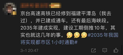 对此,一位已经目睹福平铁路建成通车的网友留言写道:“还有最后海峡段,2035年建成实现,建设工期倒推10年,其实也就这几年的事。”
