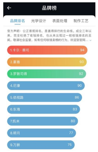 下面是镜片的排行榜,大家可以参考一下,能选好一点的镜片,就选好一点的镜片吧。