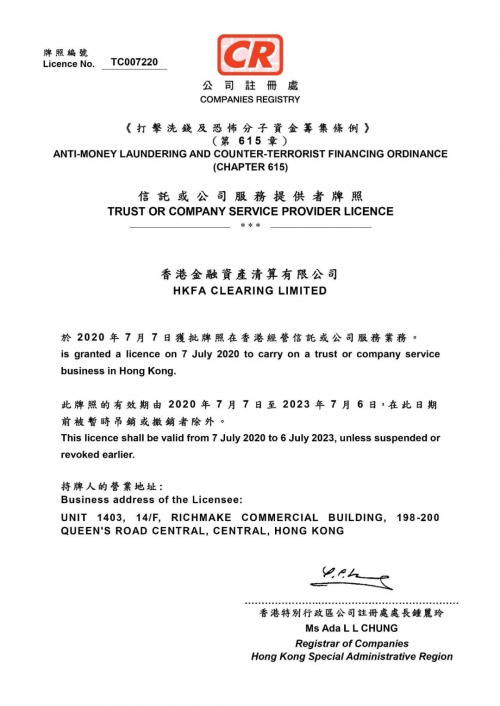 合作机构香港金融资产清算有限公司获香港公司注册处颁发的《信托或公司服务提供者牌照》