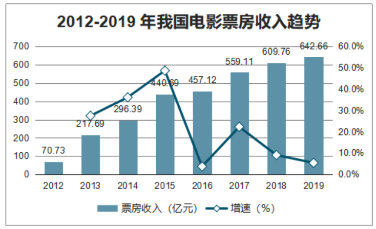 但如果抛开疫情之年2020不看,近年来我国电影票房却是一直呈现逐年递增的趋势——2019年我国影业取得了642.66亿元的票房收入,是2012年票房收入70.73亿元的9倍,8年来的复合增长率为32%,超过了全球任何国家的票房增长。