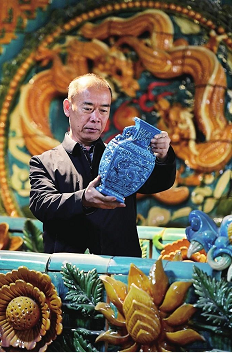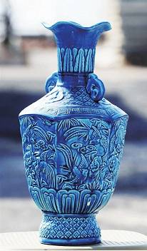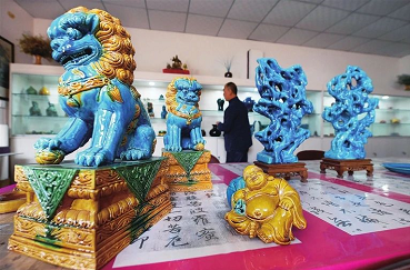 苏永军介绍说,“宫廷黄”是苏氏琉璃独有的,只有用东山特有的矿物质原料才能烧制,是苏家数代工匠在制作过程中不断试验和研究最终确定的釉彩配方。琉璃制作,配制釉彩技术含量最高,也是每个工匠的成名绝技。在苏氏琉璃所擅长的众多色彩中,尤以孔雀蓝釉最为名贵。孔雀蓝、孔雀绿、孔雀紫这三种顶级色彩,被称为“苏三彩”,是祖辈们一辈一辈传下来的技艺。他说,研制孔雀蓝釉的繁复程度,很难用语言表达,费尽了师徒的心力,终于将尘封于历史记忆中的苏氏琉璃完美地重新呈现。2008年,苏氏琉璃制作技艺被评定为国家级非物质文化遗产保护项目。
