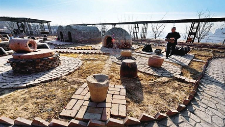 迎泽区马庄山头村,有一个叫"山头窑址"的地方。僻静的县乡公路边儿,一座砖墙围起的普通宅院,黑色的大门两侧,是一副简单的楹联:传承苏氏琉璃,弘扬山西文化。楹联琉璃质地,黄底蓝字。黄,是宫廷黄。蓝,是孔雀蓝。