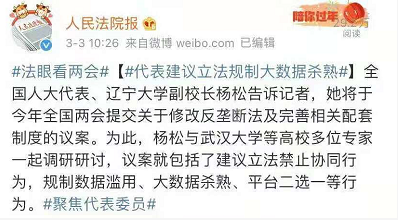 这也并不是大数据区别对待用户第一次遭到社会质疑了。据人民法院报报道,全国人大代表、辽宁大学副校长杨松表示,她将于今年全国两会提交关于修改反垄断法及完善相关配套制度的议案。为此,杨松与武汉大学等高校多位专家一起调研研讨,议案就包括了建议立法禁止协同行为,规制数据滥用、大数据杀熟、平台二选一等行为。
