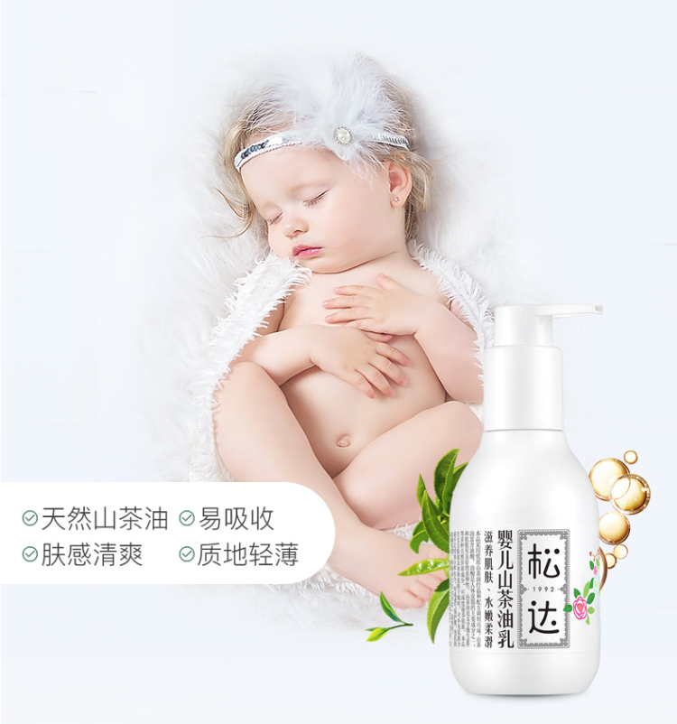 宝宝日常使用频率最高的护肤品,除了面霜,当属身体乳,尤其在干燥的季节,妈妈更应常备滋润身体乳。宝宝肌肤系统尚处于发育阶段,皮表屏障脆弱,易流失水分与天然分泌的皮脂,因此稍不留意便会出现干燥起皮,甚至皲裂泛红的现象。宝宝用身体乳既要选择安全性有保障,滋润肌肤的同时不造成不良反应,又要考虑到宝宝使用时具体的肤感,易涂抹好吸收,不造成肌肤粘腻感为佳。知名国货松达旗下的松达婴儿山茶油乳液,宝宝一年四季都可用,安心品质全身皆可涂抹,亲和无香,一抹水润,天然植物油加持,快速吸收无负担,呵护宝宝娇嫩肌。