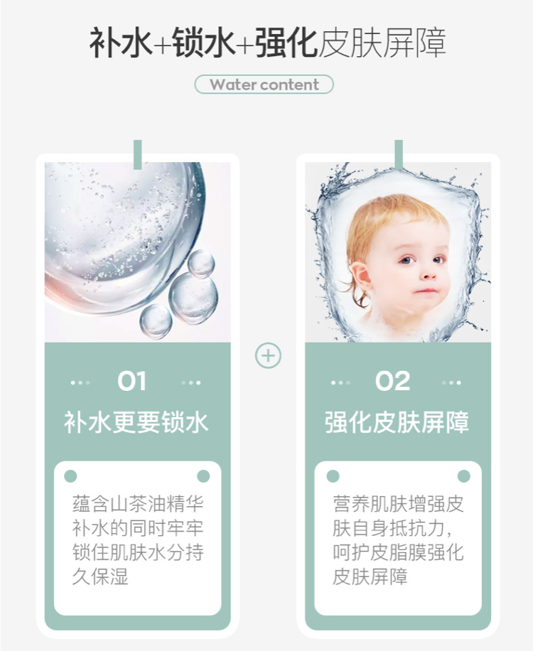 松达婴儿山茶油乳液在安全性上做到了高程度的保障,首先诸如防腐剂、激素、香精等有害或刺激性成分一律加以杜绝,其次也不添加矿物油、动物油等不适合宝宝使用的油脂成分,一来避免过于厚重难以吸收的现象产生,二来也防止宝宝因护肤品过强的封闭性而导致肌肤炎症。松达婴儿山茶油乳液配方简单,选用的天然优质的山茶油成分,在温和度和亲肤性能上都做到了相对地优异,涂抹之后快速缓解娇嫩肌肤因缺水导致的干燥、紧绷现象。吸收快速,且吸收后会在肌肤表面形成天然的锁水屏障,防止肌肤进一步流失水分。肤感舒适零负担,涂抹之后宝宝的肌肤依旧可以轻松“呼吸”,不会因吸收性能不佳导致令宝宝不适的粘腻感与厚重感。