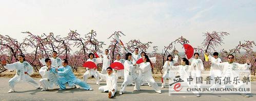 3月30日,在盐湖区陶村镇桃花岭的桃园里,太极拳爱好者为游客表演。