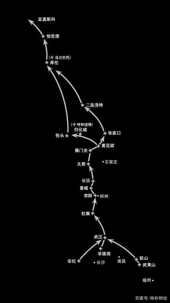 然而,中国商人走的仍然是传统的陆路,从汉口用骡马车经河南穿太行山进入晋中,然后北上太原出雁门关分两路,一路经杀虎口前往归化(今呼和浩特市)、库伦(乌兰巴托),另一路经大同、河北到张家口、恰克图,出归化、张家口后的商路仍走传统的驼道。