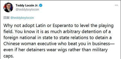 随后,洛钦又在转发下追加评论称:“为什么不采用拉丁语或世界语来创造公平的竞争环境呢?你知道,拘留一个在商业上击败你的中国女高管,就是在国家关系上任意拘留一个外国人的行为,即使拘留她的人戴的是假发而不是军帽。”