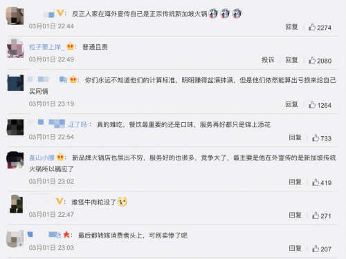 新品牌火锅店也层出不穷,服务好的也很多,竞争大了,最主要是他在外宣传的是新加坡传统火锅所以膈应了。
