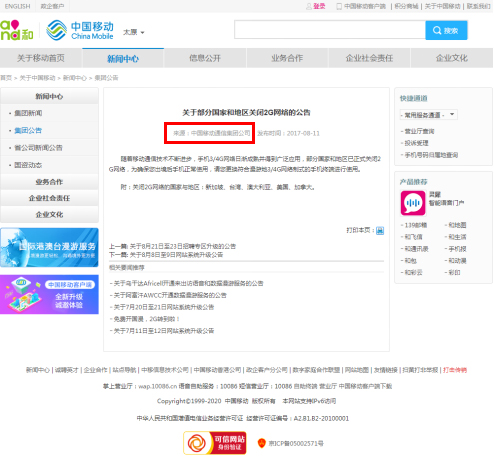 中国移动在其属下各省市业务官网上,发布“关于部分国家和地区关闭2G网络的公告”,上述明确提醒应需要及时更换合适网络或终端(详见下图四)。