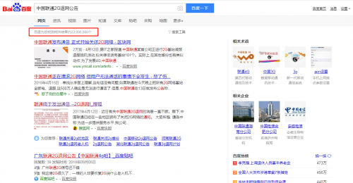 中国联通宣布2020年6月1日, 2G网络停止服务,对旗下用户建议更换3G/4G设备终端。百度搜索“中国联通2G退网公告”,出现高达2200万条搜索结果(详见下图五)。当中不乏许多号称“内部公告”的贴图。
