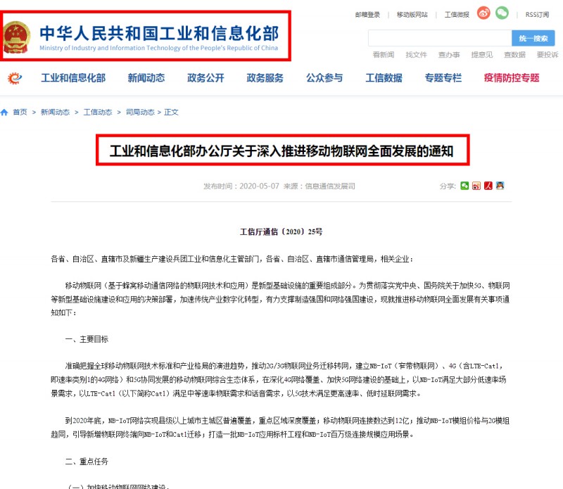 就在日前,国家工信部5月7日颁布了《关于深入推进移动物联网全面发展的通知 工信厅通信(2020)25号 》文。尤其在建设目标上,工信部明确指引:“为实现以上重点任务和目标,将制定发展路线图,顺应移动通信技术更迭规律、产业发展趋势及资源高效利用要求,以NB-IoT与Cat1协同承接2G/3G物联连接,提升频谱利用效率。在保障存量物联网终端网络服务水平的同时,引导新增物联网终端不再使用2G/3G网络,推动存量2G/3G物联网业务向NB-IoT/4G(Cat1)/5G网络迁移。”