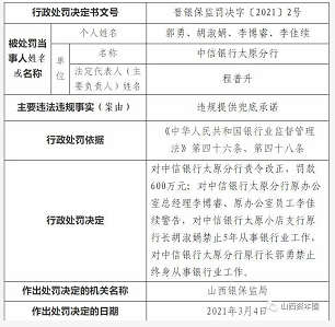 此次处罚公告显示,因中信银行太原分行违规提供兜底承诺,山西银保监局依据《银行业监督管理法》第四十六条、第四十八条,对中信银行太原分行责令改正,罚款600万元;对中信银行太原分行原办公室总经理李博睿、原办公室员工李佳续警告,对中信银行太原小店支行原行长胡淑娟禁止5年从事银行业工作,对中信银行太原分行原行长郭勇禁止终身从事银行业工作。