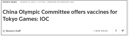 3月11日,据知名奥运新闻网站“Inside the Games”以及路透社、法新社报道,国际奥委会(IOC)主席托马斯·巴赫(Thomas Bach)当天透露,该组织将为未来两届奥运会参赛者采购中国新冠疫苗,中国奥委会已主动提出要为东京奥运会和北京冬奥运的参赛者提供疫苗剂量。