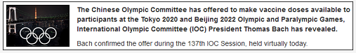 “中国奥委会已向国际奥委会主动提出,将向2020年东京奥运会(延期一年但名称不变)和2022年北京冬奥会的参赛者提供的疫苗剂量。”巴赫代表国际奥委会对中方的这一提议表示了感谢,称这一举动堪称是“真正的奥林匹克团结精神”。