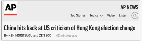 例如美联社在另一篇报道中写道,北京明确表示“只有真正的爱国者才能进入立法会,不包括政府批评人士以及任何与北京有明显分歧的人。”《华尔街日报》干脆在标题中就抹黑道:“中国用‘只准爱国者(Patriots Only)’的规则,几近终结香港民主。”