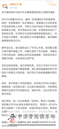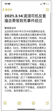 3月15日11:38,滴滴官方@滴滴出行 发布《关于福州快车司机开车冲撞乘客致其身亡的情况通报》。