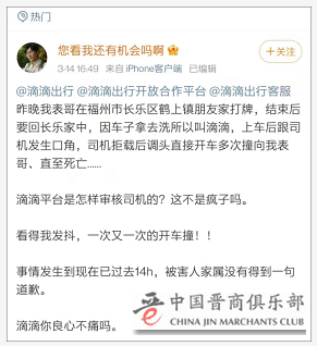 3月14日凌晨2点左右,福州一名滴滴快车司机高某某接到一名男乘客和一名女乘客后,男乘客认为司机夜里打电话影响家人休息,司机认为自己到达订单起点后联系乘客无过错,双方因此发生口角,女乘客及时进行了劝阻但未果,后司机开车连续冲撞男乘客致其身亡。对于这起不幸事件,我们感到万分悲痛和震惊,强烈谴责施暴者的恶劣行为。
