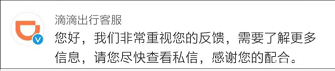 对此,滴滴公司客服随后在杨珊发帖评论区回应称,公司非常重视杨珊反馈的情况,需要了解更多信息,已私信与其联系。