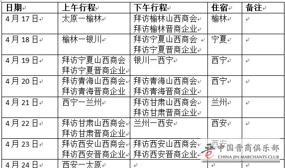 中国晋商俱乐部2016拜访西北四省市晋商商会行程表(以此为参考,如有局部调整,及时通知相关方):