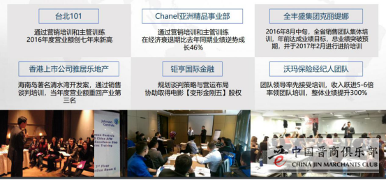 也为各行各业的公司业务带来了非凡的销售业绩:①台北101:通过销售培训和主管训练,2016年度营业额创七年来新高;②Chanel亚洲精品事业部:③全丰盛集团克丽缇娜:2016年8月中旬,全省销售团队集体培训,年前达成业绩目标,总业绩突破预期,并于2017年2月进行进阶培训;④香港上市公司雅居乐地产:海南岛清水湾开发案,通过销售谈判培训,当年度营业额重回产业第三名;⑤钜亨国际金融:规划谈判策略与营运布局协助取得电影【变形金刚五】股权;⑥沃玛保险经纪人团队:团队领导率先接受培训,收入跃进5-6倍率领团队培训,整体业绩提升300%。