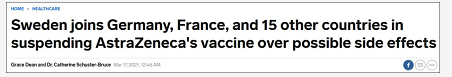 由于接种者血栓、死亡事件频发或采取预防性措施,截至15日,已有丹麦、挪威、冰岛、爱尔兰、荷兰、德国、法国、意大利、西班牙、葡萄牙、斯洛文尼亚、瑞典等至少18个欧洲国家暂停接种阿斯利康疫苗,对欧洲整体疫苗接种进程影响甚大。
