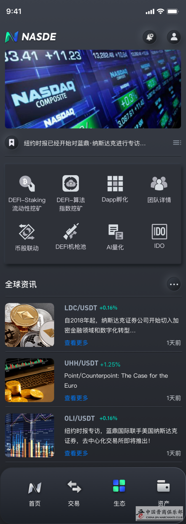 纳斯达克交易平台,DEFI2.0全生态升级玩法,六大生态应用,完善生态链反哺蓝鼎国际。