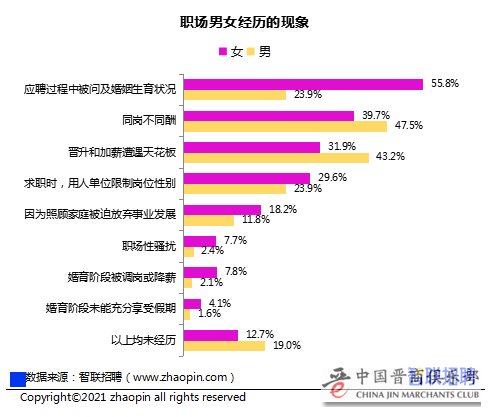 根据智联招聘的调查显示,对于女性来讲,“应聘过程中被问及婚姻生育状况”现象最为普遍,有遭遇的女性占比55.8%,比男性职场人两倍还多。且男性本科生和女性本科生的比例都是84%,目前来看并没有什么区别。但是在高层职位当中,29.6%的女性曾在求职时因为性别原因被用人单位限制,在婚育阶段被调岗降薪、未享受假期的女性分别占7.8%、4.1%。