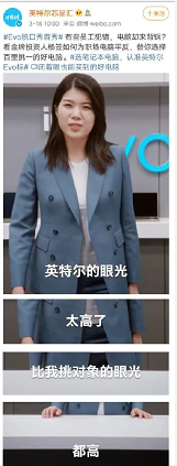 3月18日,英特尔消费类产品官微@英特尔芯品汇发布了一则杨笠宣传英特尔相关产品的微博。在宣传视频中,杨笠表示,“英特尔的眼光太高了,比我挑对象的眼光都高。” 并配文,“看金牌投资人杨笠如何为职场电脑平反”。