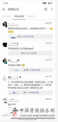 目前,在@英特尔中国的官方微博下方评论已达到2万条,内容多为针对此次事件两方网友的争吵。