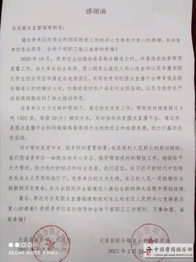 2021年2月28日,尤溪联合镇人民政府、连云村民委员会给圆点直播福建频道送了一封感谢信。信中说:2020年10月,贵单位主动接洽我县联合镇连云村,开展助农扶农带货直播工作,由大学生创业导师、爱心助农达人邓小忠老师以及华夏学院大学生创业项目——华厦优品电商团队,共同在圆点直播平台带货我县联合镇连云村的梯田大米,为推动我村农产品走向全国各地以及为我村农产品拓展销路起到了极大的推动作用。通过助农扶贫直播,帮助我村销售4吨(821袋,每袋10斤)梯田大米......最后,再次感谢圆点直播福建频道对连云村老区人民的关心支持表示衷心的感谢!