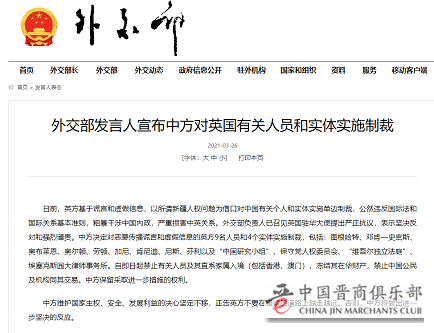 据外交部网站26日消息,外交部发言人宣布中方对英国有关人员和实体实施制裁:日前,英方基于谎言和虚假信息,以所谓新疆人权问题为借口对中国有关个人和实体实施单边制裁,公然违反国际法和国际关系基本准则,粗暴干涉中国内政,严重损害中英关系。外交部负责人已召见英国驻华大使提出严正抗议,表示坚决反对和强烈谴责。中方决定对恶意传播谎言和虚假信息的英方9名人员和4个实体实施制裁,包括:图根哈特、邓肯—史密斯、奥布莱恩、奥尔顿、劳顿、加尼、肯尼迪、尼斯、芬利以及“中国研究小组”、保守党人权委员会、“维吾尔独立法庭”、埃塞克斯园大律师事务所。自即日起禁止有关人员及其直系家属入境(包括香港、澳门),冻结其在华财产,禁止中国公民及机构同其交易。中方保留采取进一步措施的权利。