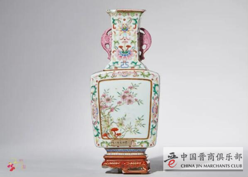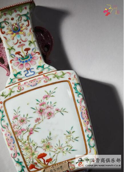 拍品为一侧平面,撇口,长颈,折肩,腹部近底稍敛,下承托泥,颈部两侧贴塑双蝠耳。通体饰粉彩缠枝莲纹,腹部开光绘粉彩桃花纹饰,花团锦簇,风姿绰约,呈现出富贵祥和的气派。底书矾红彩“乾隆年制”四字篆书横款。