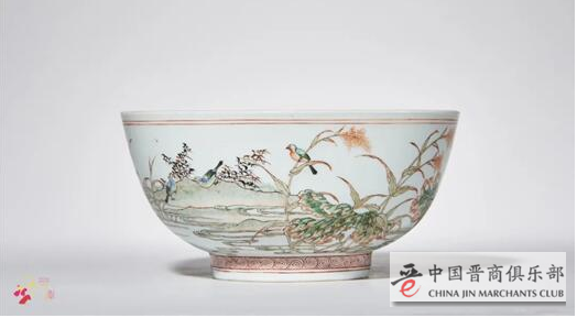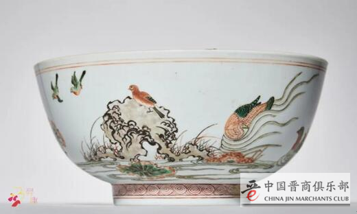 碗口微敞,深腹下敛,圈足,胎质细密,釉面莹白。碗外壁五彩绘荷塘秋禽之景:荷塘山石芦苇之间,鸳鸯翠鸟,或在飒飒秋风中展翅双飞,或在岸边草丛间成对觅食,或静立于芦苇枝头,或停驻暂歇于枯石。鸳鸯逡巡水上,层层涟猗泛起,又如秋风乍起,波光粼粼。水面上,荷叶已黄半边,随风摇曳,与嶙峋石岸、石间野草相映衬,图中设色浓淡分明,空间层次感强,荷塘秋景,幽谧天成,极富野趣。
