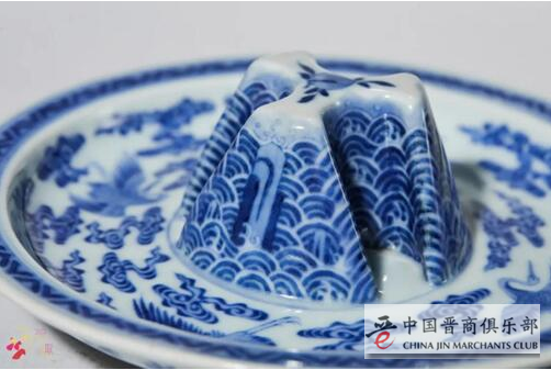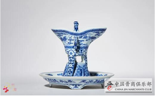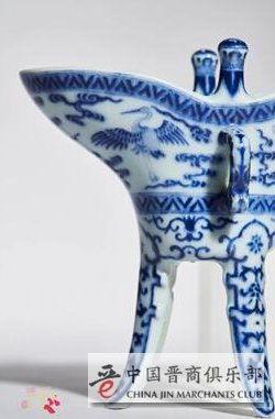 下承三个尖状长足,器身青花为饰,爵身主体纹饰为云鹤纹,寓意长寿。三足以变形蕉叶装饰,构思巧妙。以青铜器古朴瑰丽的造型与清代纹饰相结合,焕发出新颖的艺术魅力。