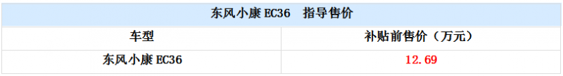 日前从东风小康获悉,东风小康电动汽车EC36目前正在火热销售中,补贴前售价为12.69万元。新车基于现款东风小康C36打造,动力上,新车采用纯电动驱动,最大功率为82马力(60kW),峰值扭矩191牛·米,搭载了容量为38.2kWh的电池组,最大续航里程200公里,并且在快充状态下2-3小时可充满电。