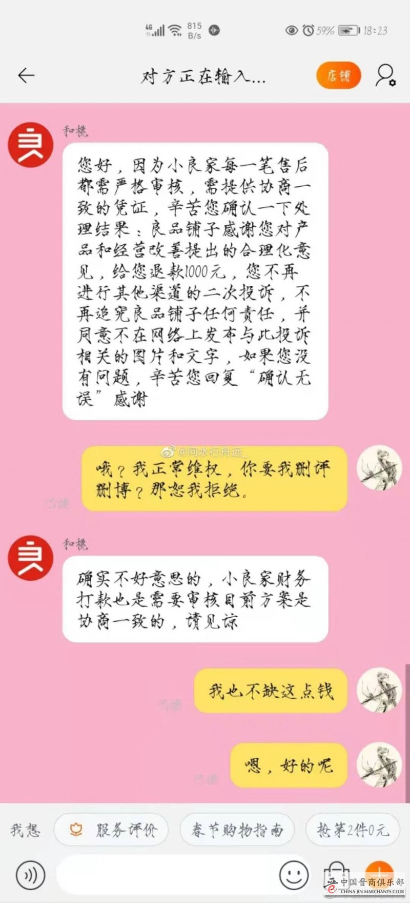 “给您退款1000元,您不再进行其他渠道的二次投诉,不再追究良品铺子任何责任,并同意不在网络上发布与此投诉有关的图片和文字。”