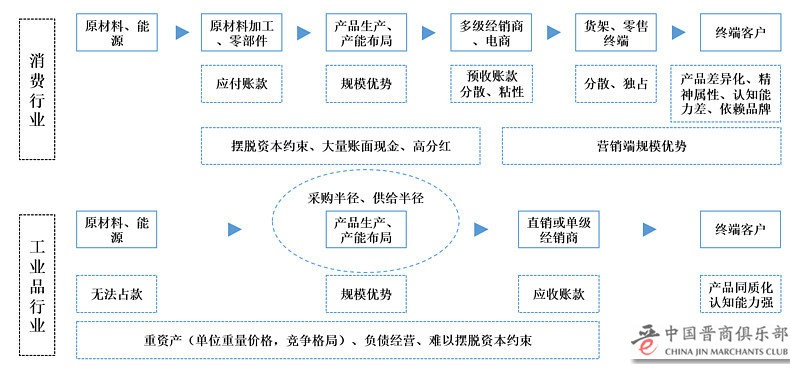 1、消费品公司上游通常为原材料加工与零部件供应商(大多为中小厂商),下游为经销商与个人,消费品龙头公司在产业链中处于核心地位,可充分享有上下游占款;大多数工业品公司上下游通常为一些大中型公司,上游占款能力弱,下游经常产生大量应收账款。两者对资本的利用能力存在显著差异。