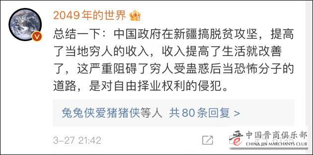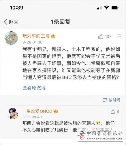 还有人分享自己的亲身经历:他有个师兄,新疆人,土木工程系的。他说如果不是国家的培养,他就可能会不学无术最后被人蛊惑去干坏事,而如今他非常骄傲和自豪地在家乡搞建设,谁又能说他被剥夺了在新疆当懒人穷汉最后被BBC忽悠去当枪使的资格?